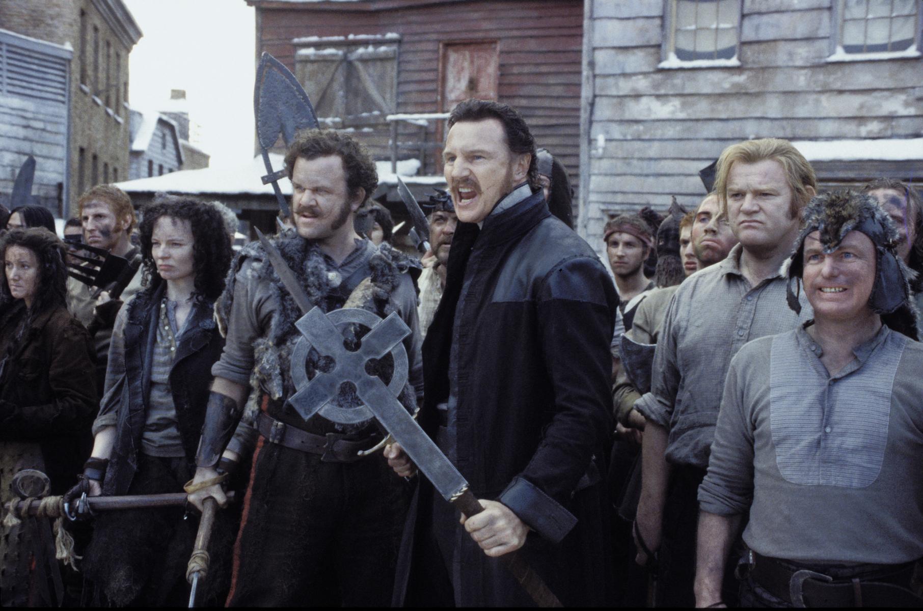 New York City, the mid-1800’s, and the crime-ridden slums of Lower Manhattan have given rise to various gangs controlling districts of the newfound metropolis. Among them, the “Natives”, led by the vicious Bill The Butcher (Daniel Day-Lewis), and the Irish immigrant Dead Rabbits, led by Priest Vallon (Liam Neeson – Taken), fight for control of the territory – the Dead Rabbits are vanquished, however the young son of the slain Priest, who watches his father’s murder at the hands of Bill, survives and is taken to an orphanage on Blackwell’s Island. Returning many years later, Amsterdam Vallon (Leonardo DiCaprio) ingratiates himself into Bill’s gang through the friendship of Jimmy Sirocco (Henry Thomas – ET: The Extra-terrestrial), in order to carry out a long-held dream of revenge against the gangster, however his burgeoning romance with pickpocket Jenny Everdene (Cameron Diaz – Charlie’s Angels), and having to navigate the various corruptions within the local constabulary (John C Reilly – Talladega Nights) and political factions (Jim Broadbent alongside Eddie Marsan) and the blithering influence of the high society types from Midtown (David Hemmings – Gladiator), make exacting his vengeance a tricky proposition indeed.