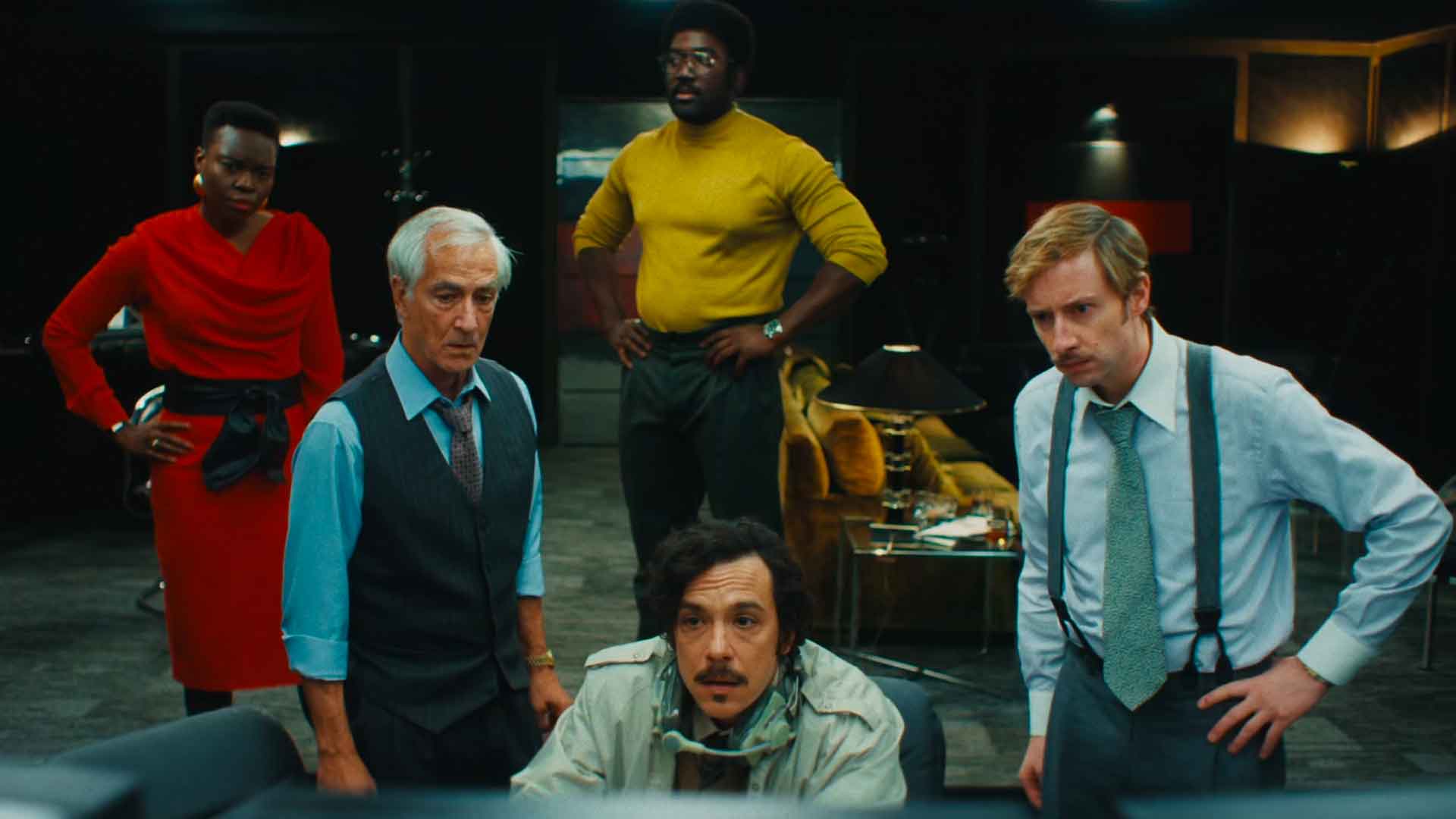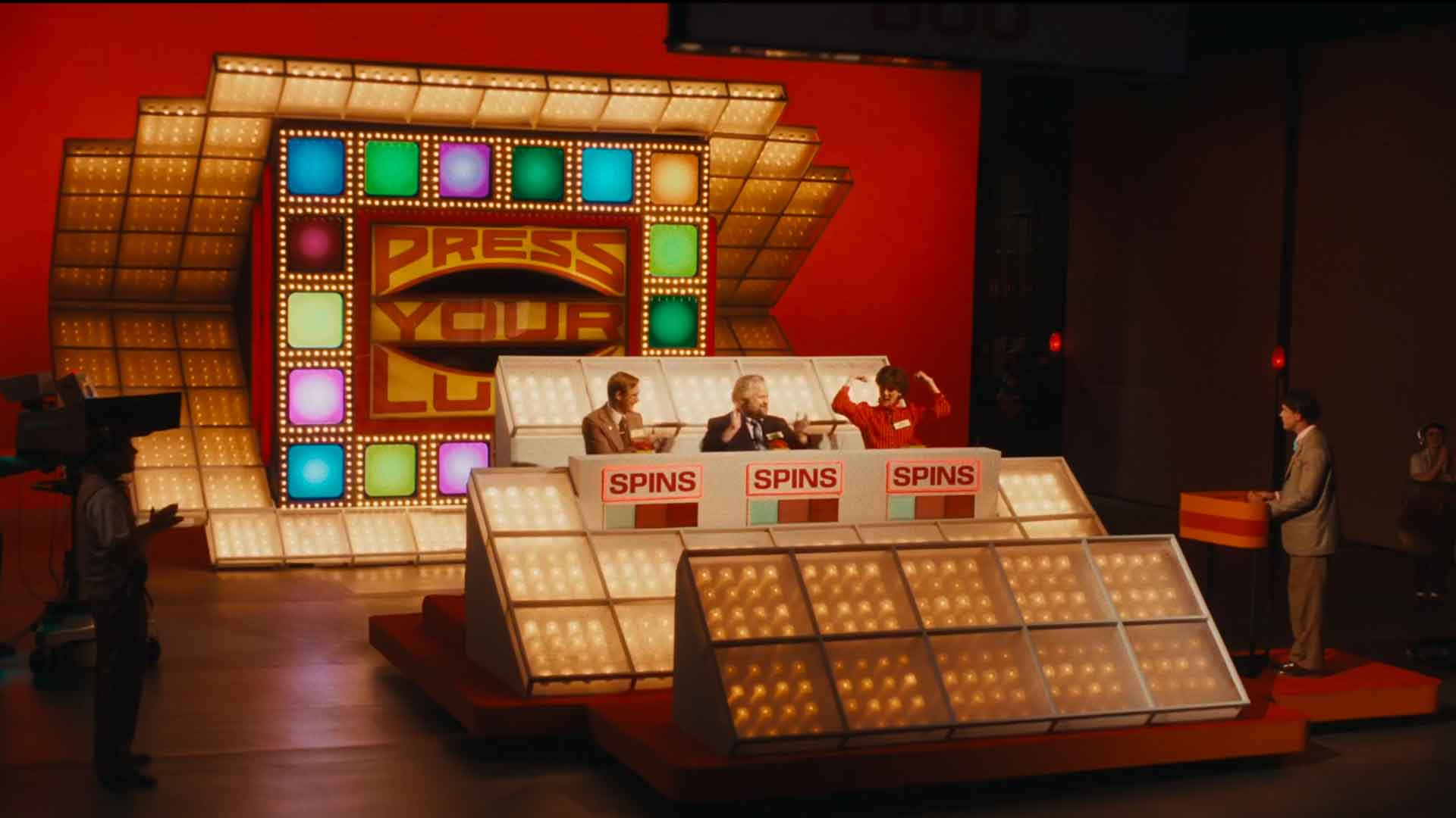 When Larsen appeared on an episode of the then-popular game show Press Your Luck in 1984, neither the producers nor the audience had any idea of the magnitude of what he was about to accomplish. The game itself was a simple exercise in chance: contestants pressed a buzzer to stop a swirling, multi-patterned board of cash prizes – or a Whammy, which instantly wiped out all accumulated winnings. Typical episode winnings capped out at around $14,000, a substantial sum at the time. By continuing to play, Larsen’s episode ultimately stretched into two, across two consecutive broadcasts on CBS, with Larsen steadily building an enormous cash pool as he seemingly defied probability. Egged on by the in-studio crowd, and opposed behind the scenes by increasingly panicked show producer Bill Carruthers (David Strathairn), who desperately wanted Larsen to hit a Whammy, the episode becomes a quiet war of attrition. With CBS executive Kauffman (Damian Young) breathing fire over the mounting losses, the show’s architects attempt to put Larsen off his game, to absolutely no avail.