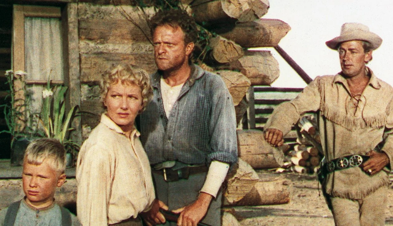 As archetypal Hollywood westerns go, they don’t come much more archetypal than Shane. Set in the late 1880s, the story revolves around a settler family in America’s Wyoming Territory and their conflict with local ranchers who want to push all the homesteaders off their once free-range land. Along comes the mysterious Shane (Alan Ladd), a drifter of sorts whose dark past he tries to keep hidden until the violence becomes too great for him to remain idyllically pacifistic. The family – Joe Starrett (Van Heflin), his wife Marian (Jean Arthur) and their young son Joey (Brandon deWilde) – are the de facto leaders of their small group of settlers, residing near a muddy outpost town where cattle baron Rufus Ryker (Emile Meyer) recruits a dangerous gunslinger, Jack Wilson (Jack Palance in an early role), to run the homesteaders off their properties.